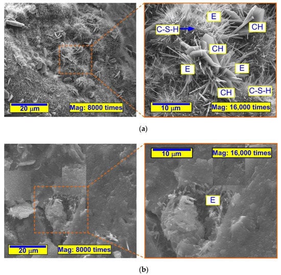 Figure 3 shows sample representative SEM images of the microstructures of all the green quaternary concretes analyzed after 28 days of curing. Additionally, descriptions of characteristic details observed in the structure of all materials are summarized in Table 8.