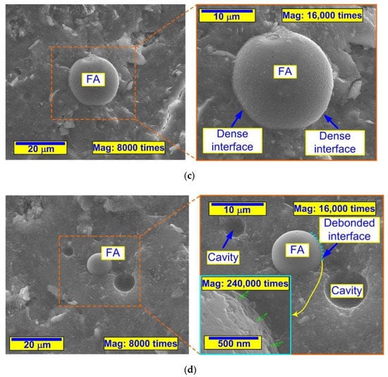 This phenomenon, mentioned above, can be observed using magnification unprecedented for this type of material, i.e., 240,000 times. Thanks to this, it was possible to capture details and diagnosis of microcracks at the grain contact. One such magnification is presented in Figure 3d. In addition, in the concrete of the Q3 series numerous places with separated FA grains were observed. It can be concluded that the structure of this quaternary concrete presented in the SEM photographs is definitely the least favorable.