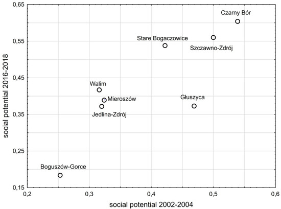 Scatter plot of social development potential in 2002–2004 vs. 2016–2018. Source: authors’ compilation based on bdl.stat.gov.pl (accessed on 30 October 2020) [32].