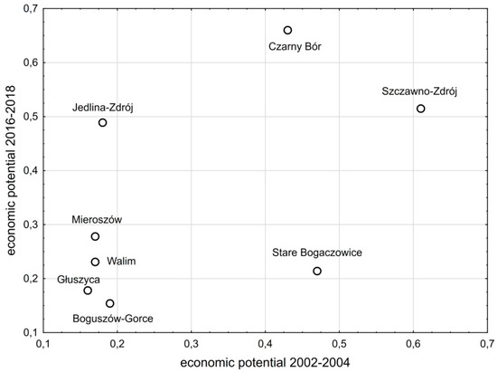 The municipalities presenting the highest economic potential in 2016–2018 were, in the following order, Czarny Bór, Szczawno Zdrój and Jedlina Zdrój; the potential significantly increased since the beginning of the century in Czarny Bór and Jedlina Zdrój (Figure 2). Boguszów-Gorce, Głuszyca, Mieroszów and Walim, whose economic potential was relatively low, show a clear concentration in both analysed periods.