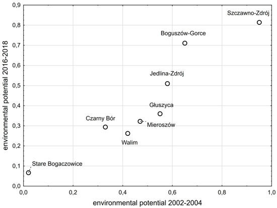The least significant changes when comparing 2002–2004 and 2016–2018 took place in terms of the environmental potential (Table 5). The highest indicator in both analysed periods was recorded in Szczawno Zdrój and Boguszów-Gorce.