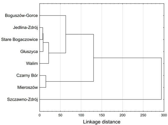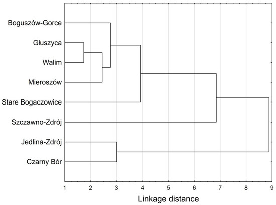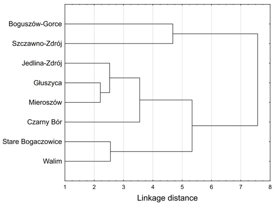 The agglomeration method (Figure 4) shows that the social potential parameters of Szczawno-Zdrój included in the research differ significantly from the parameters of other municipalities. The municipalities most similar in this respect are Jedlina Zdrój, Stare Bogaczowice and Głuszyca. Taking into account the cluster analysis tree in terms of economic potential (Figure 5), it was found that Czarny Bór and Jedlina Zdrój constitute a separate group. As regards the environmental potential indicator, the highest value in both analysed periods was achieved by Szczawno Zdrój and Boguszów-Gorace. They also constitute a separate cluster in the agglomeration method (Figure 6). Stare Bogaczowice and Walim were similar in terms of environmental parameters, characterised by the lowest Q indicator.