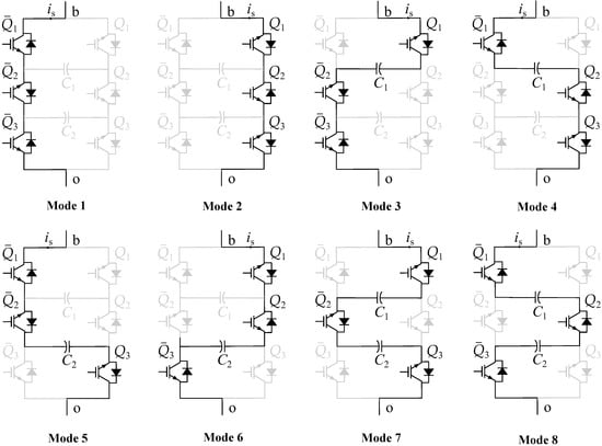 In the HMLI topology, the cascaded converter module is a vital part of circuit topology. It guarantees the seven-level output voltage of the HMLI with minimum harmonic distortion. The five-level output voltage of the cascaded converter module is ensured by the eight distinct switching modes depicted in Figure 4 when the DC-link capacitor voltage is balanced to its reference value. The cascaded converter module has redundancy for output voltage level, namely ± and zero levels, which ensures controllability of the capacitor; however, the ±2 has a unique state. The change in the ±2 is only determined by the direction of the current. As the cascaded converter gives harmonic component support to the HMLI, the DC-link capacitor charge is affected when the power is dissipated across the semiconductor devices during switching to attain the desired output voltage levels. Moreover, the DC-link capacitor voltage also deviates from its reference value when the output terminals are connected through any single capacitor. This happens when the output voltage level ± is achieved; these switching states affect the DC-link capacitor voltage by either charging or discharging it, depending on the converter’s current direction as given in Table 2.
