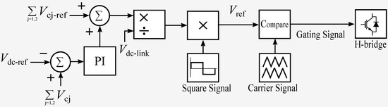 The cascaded module in the circuit arrangement of seven-level provides harmonic and high switching frequency support. Therefore, the current control is implemented in this module. To track the current to its reference, DC-link capacitors need to generate the desired voltage for the required output current. Moreover, the power dissipation across the semiconductor devices during the switching is fed by these capacitors. Therefore, the summated DC-link regulation of the DC-link capacitor is needed to ensure the safe operation of the converter. To maintain the common-mode DC-link voltage to desired voltage level, the H-bridge cell which provides fundamental component support will vary the fundamental component period to provide an amount of energy needed to the cascaded module subject to Equation (19) Figure 6 depicts the common-mode voltage regulation in which the error of the summated DC-link voltage with its reference value is compensated through PI controller and added in the reference common-mode DC-link capacitors voltage to calculate the initial angle of the H-bridge cell. This will vary the modulation signal amplitude according to the energy need to the cascaded converter module and compared further with the carriers signals of 50 Hz to attain the switching signal for the H-bridge cell.