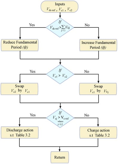 Furthermore, due to parametric variances and switching delays, the individual DC-link capacitor voltage may deviate from its reference DC-value. The charge swapping technique by redundant switching states selection in Figure 4 is used to converge the DC-link capacitors voltage value to its desired reference. In Figure 7, a flow chart demonstrates the voltage control algorithm of the overall converter.