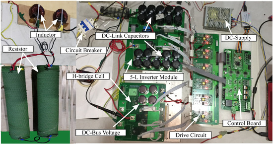 The seven-level HMLI configuration shown in Figure 3 is simulated in MATLAB sim-power environment to demonstrate the system’s effectiveness and performance of the modulation and control scheme. The proposed converter and its control scheme are experimentally validated by a low-voltage laboratory prototype as depicted in Figure 8. The control algorithm is implemented on a customized control board that uses TMS320C28346 DelfinoTM micro-controller unit (MCU), EPM570 ALTERA® complex programmable logic device (CPLD), and AD Conversion to realize the control in practice. To verify the converter system results, simulation results are scaled accordingly to low-voltage laboratory prototype using the system’s parameters listed in Table 3. The selection of all component values is achieved with extensive simulations. The MPC algorithm is employed with a sampling frequency of 12 kHz.