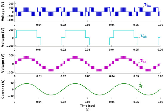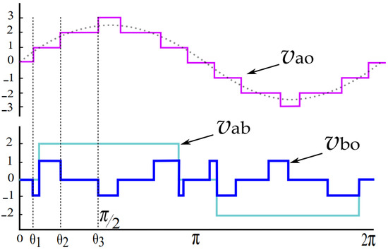 Figure 9 represents the overall output voltage of the HMLI inverter () which is the addition of H-bridge output voltage () and CCM output voltage () and can be equated as given in Equations (16)–(19). Figure 9 depicts the output of seven-level ±3Vdc, ±2Vdc, ±Vdc, and 0, which is achieved by operating the converter modules as per the desired switching states listed in Table 4. The h-bridge converter is connected to 2Vdc and will produce output voltage levels of ±2Vdc and 0, whereas the cascaded converter module (CCM) circuit consists of two DC-link capacitors C1 and C2, which are initially charged at Vc1 = Vc2 = Vdc and will provide harmonic component support.