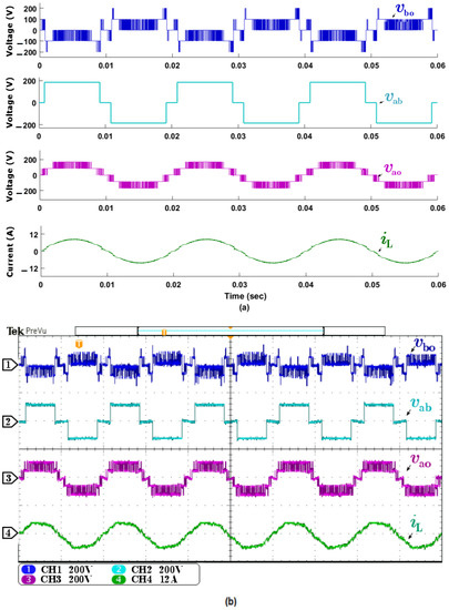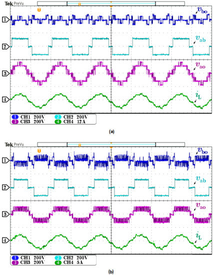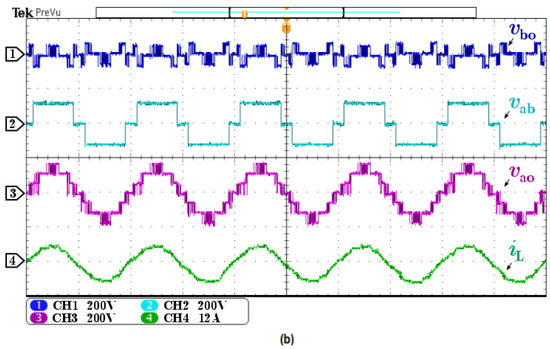 Figure 12 depicts the experimental results of the seven-level inverter output voltage at different modulation indexes and inverter current waveform for load-B. Figure 12a shows experimental results of the inverter which generates the desired output voltage to track the current to its reference value for load-B at M = 1.1, whereas, Figure 12b show experimental results of the inverter which generates the desired output voltage to track the current to its reference value for load-B at M = 0.9.