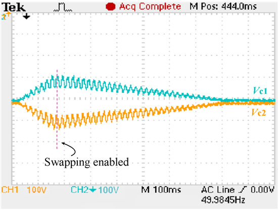 Balanced DC-link capacitor voltage, traces channel 1 and 2 (100 V/div).