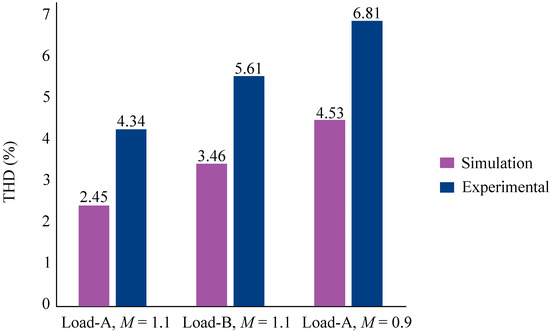 Figure 13 shows experimental validation of the voltage control. The common-mode DC-link capacitors voltage is regulated to its reference value with the modification of fundamental component duty cycle subject to Figure 7. Once the common-mode voltage is regulated, the individual DC-link capacitor voltage deviates from its reference value due to the parametric variance and switching delay. To converge the individual capacitor to its reference value, the redundant states are used to swap the capacitor charge among each other, which can be seen in Figure 13. The converter performance is tested for three cases implemented in simulation and on laboratory prototype, and their respective satisfactory THD results are presented in Figure 14. The THD estimations by Fast Fourier Transform (FFT) is shown for three different cases with a simulation THD of 2.45% for load-A at M = 1.1, 3.46% for load-B at M = 1.1, and 4.53% for load-A at M = 0.9. However, the experimental THD of 4.34% for load-A at M = 1.1, 5.61% for load-B at M = 1.1, and 6.81% for load-A at M = 0.9 is achieved. The simulation THD is comparatively lowered than that of experimental THD because of the losses and noise.