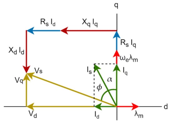 In traditional motor drive system, motor can be either modelled in dq frame or abc frame. In general, the motor is usually modelled and controlled in dq reference frame. Referring to the phasor of PMSM in Figure 2, the steady-state dq voltages in the synchronous reference frame for a three-phase machine (non-salient pole) are given as [20],