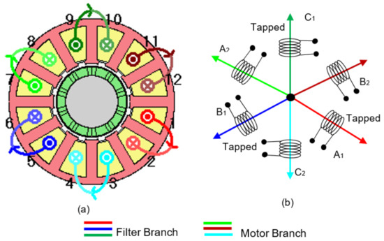The filter modelling or the estimation of filter parameters i.e., LF, CF and RF follow the same guidelines as recommended in Section 3.2, for traditional motor drive system. The physical integration of inductor is illustrated in Figure 4, where a, 12 slots and 10 poles machine is used for the application helicopter actuation system [9,10]. The machine’s stator is a single layer concentrated wound to achieve physical, thermal, and electrical separation between the phases. The rotor is constructed with “Halbach array” permanent magnets, mounted on the surface of the rotor, which is commonly used to increase the machine’s power density.