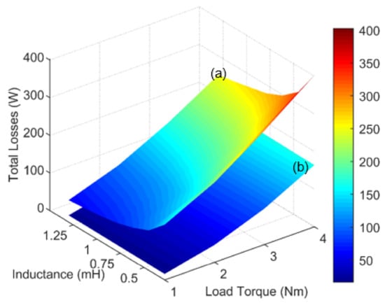 In this section, the comparative study of total loss for the motor with TFI and the motor with IFI is presented as shown in Figure 7a,b. The total power losses of the motor with IFI include motor stator and rotor iron loss, motor windings copper loss and the eddy current loss in the permanent magnets, whereas the total losses of the motor with TFI include motor stator and rotor iron loss, motor windings copper loss, magnet eddy current loss, inductor (i.e., EE-core) core iron loss inductor winding copper loss. The losses in the RC branch are neglected in this study as they remain unchanged for both integrated and traditional motor drive systems. From Figure 7, it can be observed that the total losses in the motor with IFI are far lower than the motor with TFI. The major loss component in the EE-core filter inductor is the iron loss which uses “M250-35A Non-oriented Mild Steel” laminations. The iron loss has considerably reduced for a motor with IFI that shares the same magnetic material (i.e., Cobalt Iron) with the motor, which was selected during the motor design phase [18,19]. Another key observation is that the total losses increase as the filter branch inductance is decreased. This is because the lower inductance of EE-core filter inductor results in an increase in switching current (seen by the inverter terminals) yielding to higher, frequency dependent, inductor losses. On the other hand, losses in the motor with IFI have been reduced due to the fact that the switching component in the motor branch windings is compensated by the transformer’s action (cf. Figure 6b).