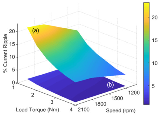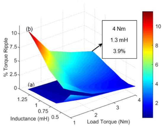 Percentage torque ripple of the motor with TFI and the motor IFI have been compared, when the load torque and filter branch inductance were varied from 1 Nm to 4 Nm and 0.28 mH to 1.3 mH respectively, as shown in Figure 8. It can be observed that the torque ripple is considerably improved in the motor with IFI when the portion of filter branch is reduced from 50% (see Table 1). This is due to the switching ripple cancellation effect between the filter branch currents and the motor branch currents. In addition, the motor branch experiences more filtered currents and voltages when the portion of filter branch inductance is reduced from 1.3 mH. Therefore, decision of selecting the portion of filter branch inductance must be made upon the requirement of the torque ripple permitted by the application, since, reducing the percentage of filter branch windings will reduce the torque ripple and, at the same time, the motor branch will see the higher portion of the filtered currents and voltages but the system’s weight and volume is likely to increase due to the increase in filter capacitance for the same cut-off frequency and attenuation level.