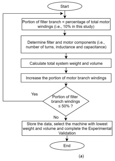Figure 9a shows the flow chart of the optimization work that has been carried out to minimize the total system mass and volume of the motor drive. It should be noted here that the % portion of the filter branch is not varied beyond 50% due to the fact that the filtering effect on the motor winding will start to reduce as the motor will experience more PWM voltages on higher portion of its windings.
