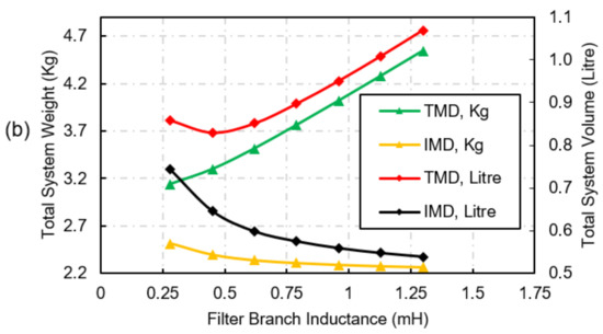 Total system weight and volume of the motor with IFI and motor with TFI are compared as shown in Figure 9. It includes weight and volume of the motor, filter inductor, filter capacitor and damping resistor, where the capacitor’s weight and volume is estimated using the datasheets of KEMET film capacitors [23]. Since the reduction in filter branch inductance increases the weight and volume of the filter capacitor therefore, from application requirement point of view, it is necessary to select the filter’s parameters at which both weight and volume are minimum. The total system weight can be obtained from (15) to (16).