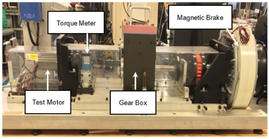 The test setup for the concept validation of the motor with IFI, when the filter branch inductance is 1.3 mH, is shown in Figure 10 and Figure 11. The Spectra Quest’s Drivetrain Diagnostics Simulator (Figure 10) is used which is specifically designed to simulate industrial drivetrains for experimentation of the motors under test. The drivetrain consists of an electric motor under test, torque transducer, gearbox system, bearing loader, speed encoder and magnetic brake [24]. In order to drive the motor under test, 3-phase, voltage source converter, which was particularly designed for HEMAS project, is used. It consists of a three-phase IGBT module, sensors and the gate-drive circuit which are integrated with a shared control system based on FPGA, DSP and DC-link LC filter. The DSP unit communicates with the swashplate control computer (SPCC) for control and monitoring purposes and estimates the modulation index for the PWM pulse, whereas, FPGA is used to interface with the sensor circuit and for the PWM pulse generation [19]. The prototype of 12 slots/10 poles, concentrated wound machine, is depicted in Figure 12a,b, where windings A2, B2 C2 represent motor branch and A1, B1 C1 correspond to the filter branch (i.e., when the filter branch portion is 50%). The RC branch of the filter circuit consist of three wire wound damping resistors (5 W and 2 Ω), and three KEMET film type capacitors (4.7 µF each, Model no. R46KR447050M2K) [20] as shown in Figure 12c.