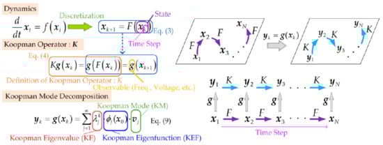 Using Equations (3), (4) and (6), the time evolution of the i-th observable at the time step derived from (7) can be expressed as Equation (8). Equation (9) demonstrates the decomposition of the observable vector into an infinite number of oscillation modes, which is called KMD. Each oscillation mode is represented by the product of KEs, KEFs, and the complex vectors , which are called Koopman modes (KMs). Figure 1 illustrates the concepts of the KO and KMD.