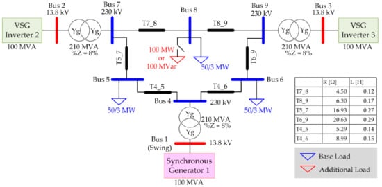 In this study, we considered the IEEE nine-bus model (three-machine system) (Figure 2). One primary power supply was assumed to be a SG, and the other two generators were assumed to be distributed power sources of inverters with batteries which were equipped with the same VSG control. In the simulation tests, the SG model was that of the standard synchronous machine installed in the simulator. Figure 2 shows the rated capacities and voltages of the generators, bus voltages, line impedance, transformer capacities, and impedance. The total base load of 100 MVA was evenly distributed in the three locations of Buses 5, 6, and 8, and the simulation started with all the power being supplied from the main power supply (SG). A load of 100 MVA was added to Bus 8 in a stepwise manner, and the system fluctuation was analyzed immediately after adding the load. By adjusting the set point of the SG, the frequency and voltage just before the load was added were set to the rated values of 50 Hz and 13.8 kV. In the standard tests, the equipment constants and control parameters of all the generators were set to be nearly identical. In the other tests, the VSG control parameter was increased or decreased for comparative purposes. The main objective of this study was to investigate the instability caused by the interference between DERs (inverters) and the nonlinearity due to the interference of the control loop in each power supply.
