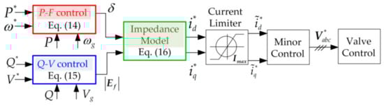 Figure 3 shows a block diagram of VSG control. A Kawasaki VSG [2,4] was used in this study. The generator phase difference angle [rad] was calculated from Equation (15), which corresponds to the block enclosed by the red rectangle in Figure 3. denotes the Laplace operator. [pu] and [pu] denote the reference and feedback values of the active power, respectively. [pu] and [pu] are respectively the reference and feedback values of the angular frequency calculated at the output terminal of the VSG inverter. [pu/pu] is the droop coefficient of the frequency () with respect to . The time constant [s] is given by , where [s] is the unit inertia constant, and the first-order lag transfer function in Equation (14) represents the swing equation. A conventional swing equation is a higher-order equation (degree 2 or higher) because it includes the governor delay time and unit inertia constant. Conversely, the swing equation of the Kawasaki VSG becomes linear when the governor delay time, which is the characteristic of the Kawasaki VSG that is the easiest to adjust, is set to 0. The magnitude of the generator (induced) voltage vector [pu] is given by Equation (16). [pu/pu] is the droop coefficient associated with the reactive power [pu], and the magnitude of the terminal (inverter) voltage vector is [pu]. [pu] and [pu] are the command values to and , respectively. [s] is the measurement delay time of the terminal voltage, and the conventional proportional-integral (PI) compensator (for which the proportional and integral coefficients are and , respectively) is used as the automatic voltage regulator (AVR). Equation (17) is the impedance model, which represents the relationship among , , and the command value vector of the inverter current. The impedance and [pu] constitute a pseudo-impedance set in the VSG control software and becomes dominant over the alternating current (AC) output filter impedance in low-frequency regions, such as commercial frequencies. The ratio of the virtual inductance to the virtual resistance was empirically set to .The current command value was limited to avoid overcurrent, and was input into the minor control, which was composed of current control. The pulse width modulation (PWM) command value () output from the minor control was input into the valve control. Because these controls are conventional, detailed explanations are not included here.