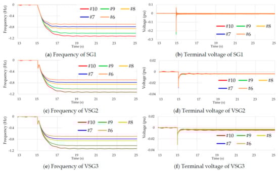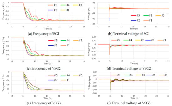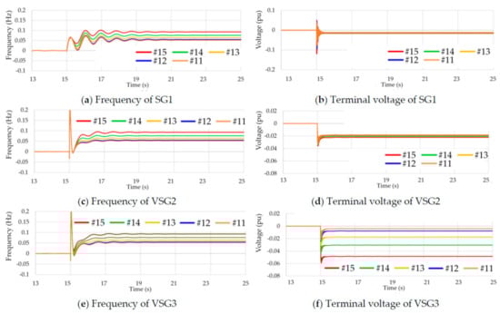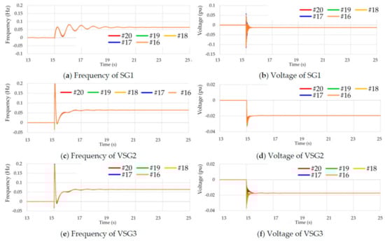 Figure 4, Figure 5, Figure 6 and Figure 7 show the simulated transient responses of the three power supplies obtained from tests 1–5, 6–10, 11–15, and 16–20, respectively. In each figure, (a–f) depict the results for SG1, VSG2, and VSG3, respectively. The left column (a,c,e) and the right column (b,d,f) present the results of frequencies and voltages measured at the terminal of each generator. Each observable (system frequency or terminal voltage of = 3000 points) was measured for 10 s from the onset time (15 s). A sample rate capable of measuring a rated system frequency of 50 Hz was required, and in this study, the sample rate was set to 250 Hz (sampling every 4 ms).
