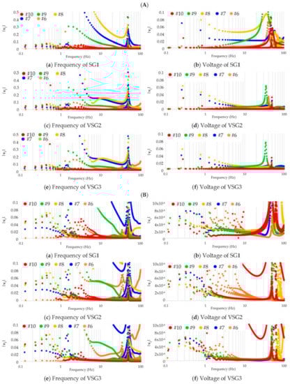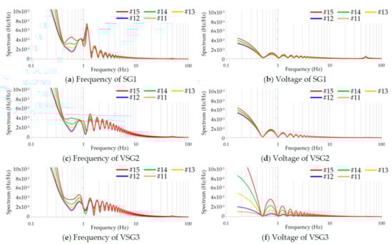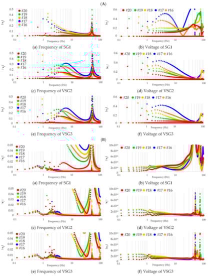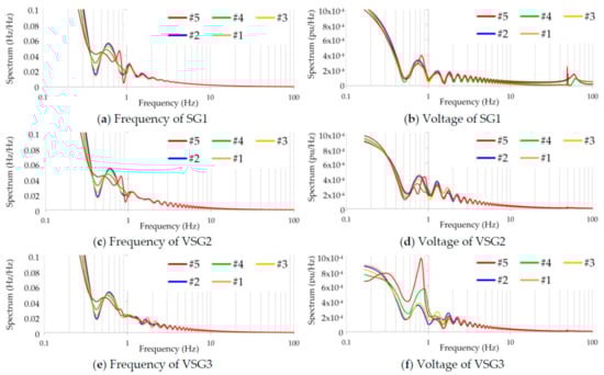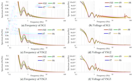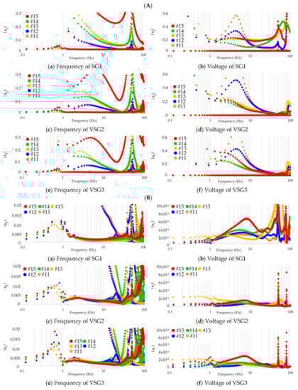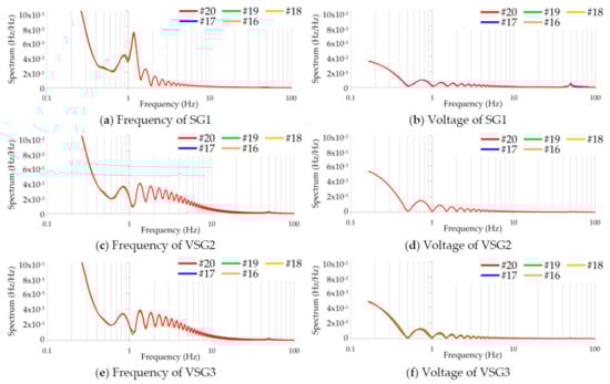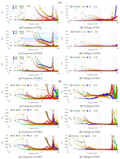 In the controls of the SG and VSGs, the active power and system frequency exhibit a control loop with the same mechanism as in Equation (15), and the control loops between the reactive power and terminal voltage can be expressed by Equation (16). Furthermore, these control loops cross-interfere, as shown in Equation (17). In tests 1–20, the effects of the active power change on the terminal voltage and of the reactive power change on the system frequency, which correspond to the cross-interference, were also confirmed in Group 4. The cross-interference in Group 4 does not appear when using the DFT, but appears when using the KMD; this can be reasonably confirmed in the right columns (b,d,f) for tests 1–10 (Figure 12A and Figure 13A) and in the left columns (a,c,e) for tests 11–20 (Figure 14A and Figure 15A). These tendencies indicate that KMD can express the interference between cross-loops relatively clearly.