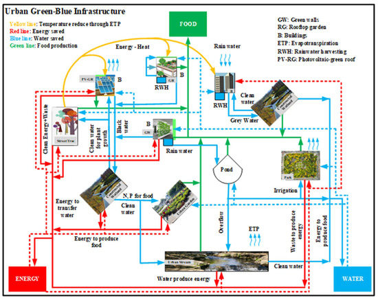 Concerning the flow of key resources for human survival, food, energy, and water can be interrelated with green and blue infrastructure (GBI). GBI is defined as a network of landscape components, which include green areas and water bodies [5]. Such an infrastructure, available within an urban space, provides diverse environmental, economic, and social benefits to people and other living organisms [6]. This green-blue system can perform various functions, having the potential to produce multiple services, such as food, water purification, temperature regulation, and others, which are crucial for urban adaptability [7]. Several developed countries implemented their GBI to minimize the urban heat effects (Germany, Australia), carbon storage (South Africa), surface runoff (Brazil, Netherland, USA), and food production (Singapore) [8].