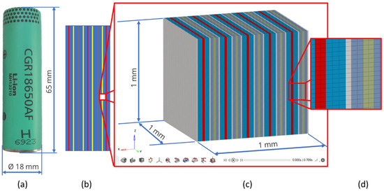 Panasonic CGR18650AF Li-Ion cell: (a) real photo and (b) schematic cut-view, (c) Finite-Element-mesh using an 1 × 1× 1 mm representative volume, (d) detailed view of the 3d hexahedron elements with an average element size of 0.01 × 0.01 × 0.01 mm showing the separator layer in white.