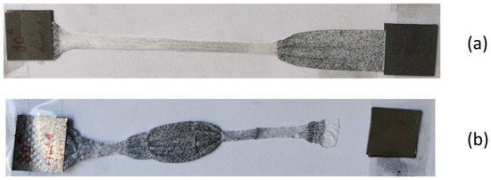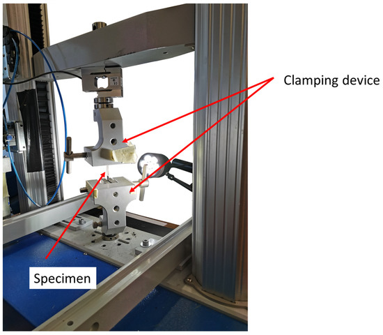 In this study, the mechanical properties of the specimen were studied by conducting tensile tests on small strips cut out in 2 perpendicular spatial directions corresponding to machined direction (MD) and transversal direction (TD) of the separator samples. Figure 2 shows the experimental setup which was used for performing the tensile tests. Each specimen with dimensions of 12 × 60 × 0.025 mm was glued at each end to metal specimen holders which led to a free test length of 36 mm. The specimens were marked with a gray pattern to enable digital image correlation (DIC), as shown in Figure 3a,b. The 3D ARAMIS system from GOM (GOM GmbH, Schmitzstraße 2, 38122 Braunschweig, Germany) was used for analysis of the strain field, shown in Figure 3c,d. Each test was repeated 5 times to ensure repeatability. Three different tension velocities were used for testing: 0.1 mm·s−1, 1 mm·s−1 and 10 mm·s−1 corresponding to strain rates 0.002778 s−1, 0.02778 s−1, and 0.2778 s−1.