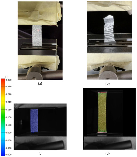Set-up of prepared specimens in MD before the test (a) and at the end of the test, after failure (b). Specimen using DIC measurement at the beginning of the test (c) and at the end of the test, briefly before failure (d), showing the inhomogeneous strain field distribution withing the specimen.
