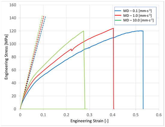Tested engineering stress vs. strain curves in machine direction (MD = 0°), at three different velocities with the corresponding Young’s moduli (dashed lines).