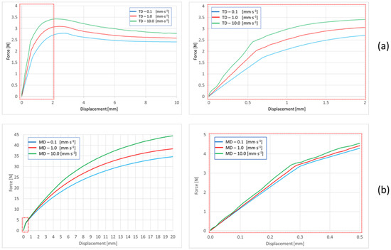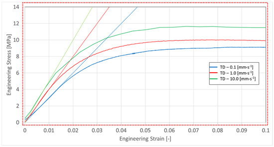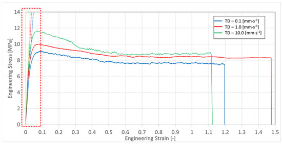 The measured elongation in TD direction was in the range of 40–53 mm, which results in 111–147% total strain. Figure 5 shows the engineering stress vs. strain curves for all three tested velocities in TD. The Young’s moduli are computed using the initial slope as shown in Figure 6, which shows a cutout (indicated with the red-dotted rectangle in Figure 5).