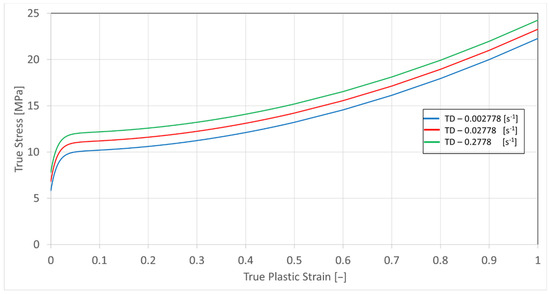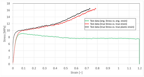 In the novel developed visco-elastic-plastic model, the true-stress vs. true-plastic-strain curves must be derived from the tested engineering-stress vs. engineering-strain curves. For the calculation of the plasticity curves in the MD direction, the approach based on Swift–Voce interpolation, described by Bulla [16], is used. However, the TD behavior is showing a much higher plasticity range beyond 100% strain. Figure 8 shows one representative engineering stress vs. engineering strain curve close to 120% total strain before the material fractures (green curve). For usage in an elasto-plastic material model, the parametrization for the engineering stress vs. engineering strain curve must be modified further. The true stress vs. true strain curve (Figure 8: red curve) is derived and then the elastic portion of the strain is subtracted from the total strain, using the linear strain–stress relation corresponding to the strain rate, dependent Young’s modulus (Figure 6: dashed lines).