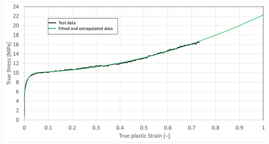 Due to the need for values beyond the curve, derived from testing, it is necessary to extrapolate the true stress vs. true plastic strain curve. Based on the work of G’Sell et al. [22] who tested such high ductile polymer materials, the parameter identification is carried out using the modified equation: