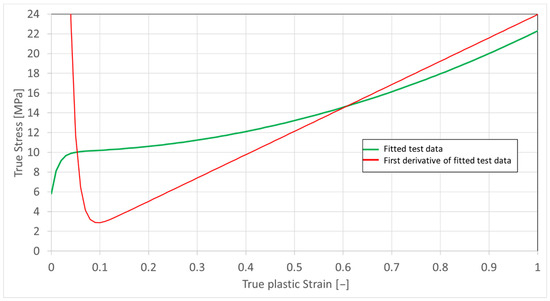 Figure 11 shows the true stress vs. true plastic strain and the first derivative in the same chart. According to Equation (8), the material instability occurs when the 1st derivative of the true stress vs. true strain curve equals the true stress value, which is the first crossing point. This corresponds to the maximum stress in the engineering stress vs. engineering strain diagram.