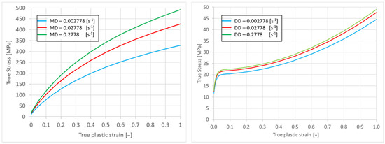 Strain rate dependent, orthotropic, hardening true stress vs. true plastic strain curves fitted to test results for MD (0°) direction (left side) and derived from tests provided in DD (45°) direction (right side).