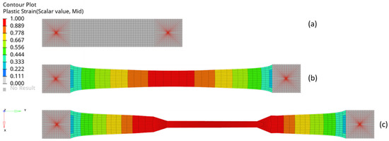 FE results showing the loading phases in the MD direction at initial stage (a), short before the first localization occurs (b) and further development of the total elongation (c).
