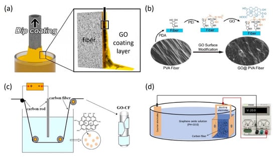 The most effective way to combine graphene and fibers is surface coating. Representative approaches for coating GO on micro-fibers involve dip coating, spray coating, chemical vapor deposition (CVD), electrophoretic deposition (EPD) method, sol-gel processing, and so forth [43,44]. For example, Yao et al. [36] employed a three-step dip coating method (Figure 1a) to fabricate the GO-coated polyvinyl alcohol (PVA) fibers. As illustrated in Figure 1b, polydopamine (PDA) was first covered onto PVA fibers through self-polymerization and subsequently grafted with polyethylenimine (PEI). The positively charged amine groups introduced by PEI help drive negatively charged GO flakes to the fiber surface via electrostatic attraction to build the amide bonds. Finally, the prepared PEI/PDA/PVA fibers were soaked into the GO solution (0.8 mg/mL) for 1 h to achieve a robust coating. Alternatively, Chen et al. [37] adopted the EPD technique to introduce GO coating on carbon fibers (CF). Before coating, electrochemical corrosion method was first used to remove the commercial sizing on the CF, in order to improve the interfacial adhesion. The electrolytic treatment system typically consists of a potentiostat/galvanostat analyzer with CF as the working electrode and a graphite cathode as the counter electrode, as shown in Figure 1c. Upon the immersion treatment of CF in GO solution (electrolytic solution, 1.5 mg/mL) for 40 min under the voltage of 15 V, the electrophoretic deposition was completed. Later, Lu et al. [38] developed a novel EPD system for the mass production of hybrid GO/CF fibers, as depicted in Figure 1d. Therein, a copper encapsulated plastic box was devised as the working electrode meanwhile containing a cluster of CF. Two holes were drilled on box and quantitative filter papers were then placed between the hole and copper paper, to allow the diffusion of GO electrolyte while avoiding the leakage of CF. Another copper plate was used as the counter electrode, kept 5 cm from the plastic container. The pH of the electrolytic solution was adjusted to 10.0 by adding sodium hydroxide into the GO solution. EPD process was finally conducted at 20 V for 1 h to coat GO on CF.