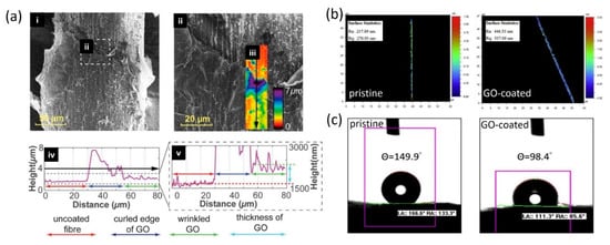 (a) Measurement of GO coating thickness on PVA fibers by AFM imaging of the boundary surface [36] (Copyright permission Elsevier 2019); (b) Surface roughness map and (c) contact angle measurement for pristine and GO-coated carbon fiber, respectively [38] (Copyright permission Elsevier 2018).