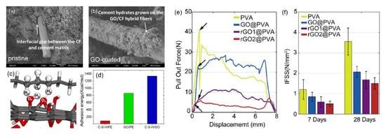 Yao et al. [39] performed single fiber pull-out test for GO-modified PVA fiber embedded in Ordinary Portland cement (OPC). By recording the maximum pull-out force (Figure 4e), the interfacial shear strength (IFSS) can be obtained based on known fiber diameter and embedded length [70,71]. Interestingly, as shown in Figure 4f, the IFSS for GO- and rGO-coated fiber/cement samples cured for 7 days exhibit even lower values than pristine fiber/cement systems. Similar IFSS trends can also be found in samples cured for 28 days (Figure 4f). One possible reason is that the stacks of multiple GO flakes are subjected to an interlayer slip under the shear loading in pull-out test. It has been reported that the interlayer shear strength between GO and rGO layers are relatively weak, while the topological defects would further cause a drastic reduction in interlayer shear strength [72,73]. Hence, while GO layers can form strong hydrogen bonds with both PVA and C–S–H, they might suffer from the cohesive failure prior to the adhesive failure, leading to the low IFSS.