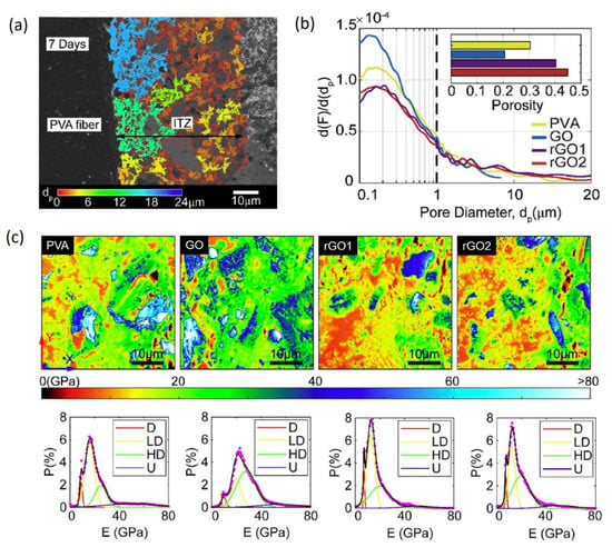 (a) BSE images of ITZ of PVA fiber/cement samples cured for 7 days, showing a color map of the equivalent pore diameters (dp); (b) Pore size distribution for various composite samples cured for 7 days. Inset shows the overall porosity of corresponding ITZs; (c) PeakForce QNM contour maps of the elastic modulus of the ITZ between cement and fibers and corresponding probability distribution of different phases in QNM contour maps, including holes and defects (D), low-density hydration product (LD), high-density product (HD) and unhydrated grains (U) [39] (Copyright permission Elsevier 2020).