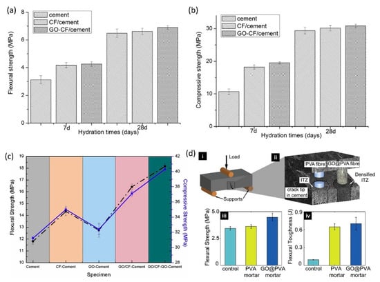 One representative example is GO-coated CF reinforced cement paste which shows improvements in both flexural and compressive strength (Figure 6a,b) [37]. Specifically, GO-CF (0.4 wt.%)/cement cured for 28 days exhibits the highest flexural strength of ~7 MPa and compressive strength of ~30 MPa, yet the mechanical enhancement appears inconspicuous. Similar strengthening phenomena in GO-CF (1.0 wt.%)/cement composites were also reported by Lu et al. [38], who performed GO coating with a newly designed EPD method. Figure 6c shows experimental results of compressive strength and flexural strength of cement paste reinforced by the CF and GO/CF fibers. Here, GO/CF-cement corresponds to the GO/CF in aqueous solution while GO/CF-GO-cement samples are obtained by dispersing GO/CF fibers first in GO solution and then mixed with cement powders, to achieve a better dispersion due to stronger electrostatic repulsion and steric stabilization. Compared with the control groups, GO/CF fibers bring a much higher compressive and flexural strength to the cement paste. The reasons can be attributed to the abovementioned reinforcing mechanisms as well as the extraordinary mechanical properties of GO itself. In addition, a better dispersion of GO/CF fibers in GO solutions further enhances the mechanical performance of cement paste. Obviously, the highest compressive and flexural strength are achieved by GO/CF-GO-cement, as high as 40.3 MPa and 18.2 MPa respectively. This results in 14.8% and 8.7% increase respectively in contrast to the control cement paste, showing a compressive strength of 29.8 MPa and flexural strength of 11.1 MPa. By directly mixing GO solution (0.06 wt.%) with CF (1.0 wt.%)/cement, Chen et al. [41] reported a 23.9% increase in compressive strength and more than 100% increment in flexural strength. It was found that the compressive strength is only affected by the presence of GO, whereas CF play a joint role in flexural strength. With increasing GO content from 0.06% to 1.0%, the mechanical enhancement of compressive and flexural strength can be further elevated to 46.9% and 43.6%, respectively.