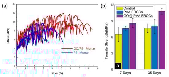 (a) Stress-strain curves of mortar with PE and GO/PE fibers in uniaxial tensile tests [40] (Copyright permission Elsevier 2020); (b) Measurement of tensile strength for GO/PVA FRCC [36] (Copyright permission Elsevier 2019).
