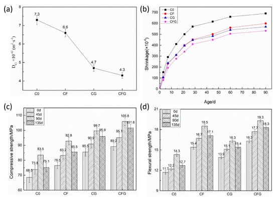 (a) Chloride migration coefficient of cementitious composite; (b) Drying shrinkage rate of specimens at different ages; (c) Compressive strength and (d) flexural strength of samples under the sulfate corrosion condition [42]. C0: control sample; CF: PVA fiber/cement; CG: GO/cement; CFG: GO/PVA fiber/cement.