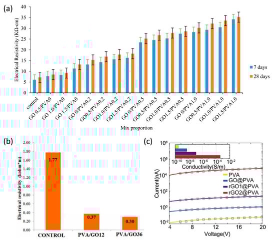 (a) Electrical resistivity of SCBA mortars with varied GO/PVA hybrid at the age of 7, 28 days [92] (Copyright permission Springer 2021); (b) Electrical resistivity of FRM with PVA/GO fillers [93] (Copyright permission Elsevier 2021); (c) Electrical conductivity measurement of oxidized graphene nanosheets-modified PVA fibers [39] (Copyright permission Elsevier 2020).