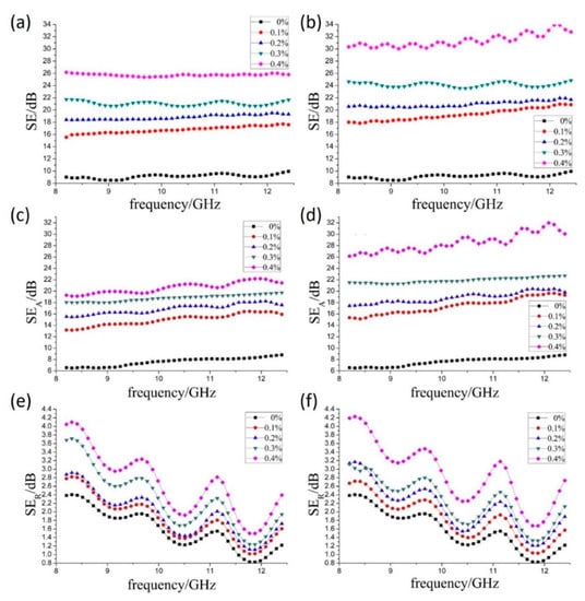 Variation of SE with frequency for (a) CF/cement and (b) GO-CF/cement composite with different mass fraction of fiber; Analysis of SEA for (c) CF/cement and (d) GO-CF/cement composite and SER for (e) CF/cement and (f) GO-CF/cement composite, respectively [37] (Copyright permission Elsevier 2015).