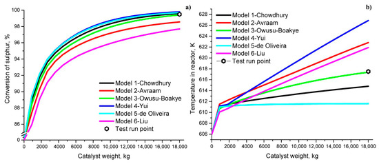 The temperature increase within the catalyst bed is shown in Figure 2b. Since the reactions occurring in the reactor (HDA and HDS) are exothermic, a temperature increase is to be expected. The degree of the temperature increase is very dependent on the applied kinetic model. The outlet temperature ranged from 611.7 K to 627.1 K and the best agreement with the experimental data was achieved using the Owusu-Boakye model.