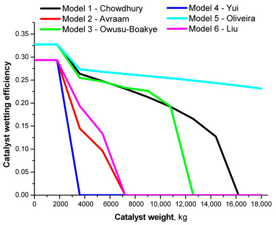 The difference in catalyst wetting efficiency between the predictions of the models, using different kinetic equations for the HDA reaction, is very significant (Figure 3). Wetting of the catalyst bed is calculated depending on the reactor design and also the catalyst particle shape and size, but mostly on the liquid flow rate and velocity. The degree of liquid evaporation is dependent on the degree of temperature increase, while temperature increase is dependent on reaction rate and heat released by chemical reactions. The lowest wetting of the catalyst bed was predicted by simulations with the Yui and Avraam HDA models, where liquid evaporates almost instantly. For these models the temperature increase was the highest. The de Oliveira model predicted the lowest temperature increase (Figure 2), therefore wetting efficiency was very high with a substantial quantity of liquid through the entire reactor length.