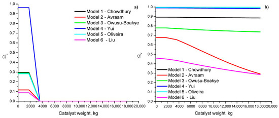 Overall effectiveness factor for: (a) liquid phase, (b) vapour phase calculated using six different kinetics models for HDA reactions.