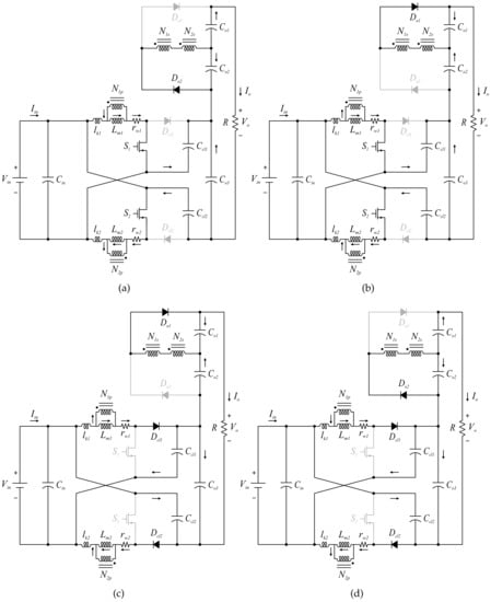 - Meier, M.B.; da Silva, S.A.; Badin, A.A.; Romaneli, E.F.R.; Gules, R. Soft-Switching High Static Gain DC–DC Converter without Auxiliary Switches. IEEE Trans. Ind. Electron. 2018, 65, 2335–2345. [Google Scholar] [CrossRef]